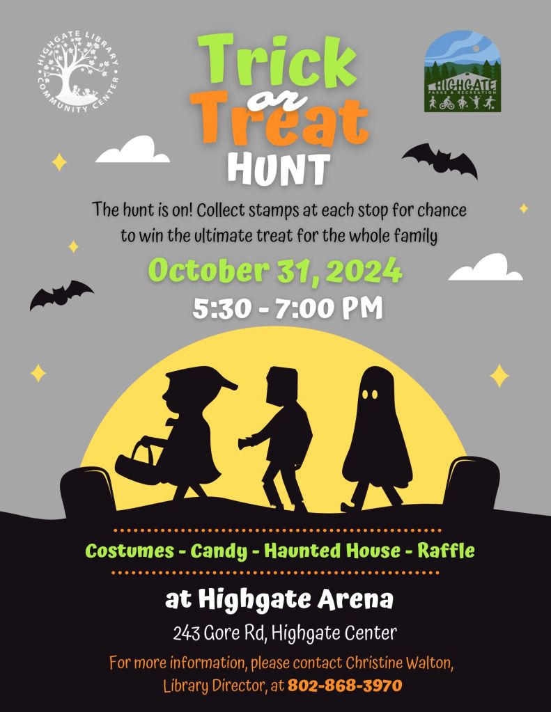 Join us at Highgate Arena on Thursday, October 31st from 5:30 PM – 7:00 PM for our Trick or Treat Hunt. Come dressed in your favorite costume. Stop by the library table near the main entrance to receive a Halloween Adventure Pass. Stop by each station to receive a stamp and a treat. Receive 10 stamps and you will be entered into our raffle at a chance to win the ultimate prize that is fun for the whole family.