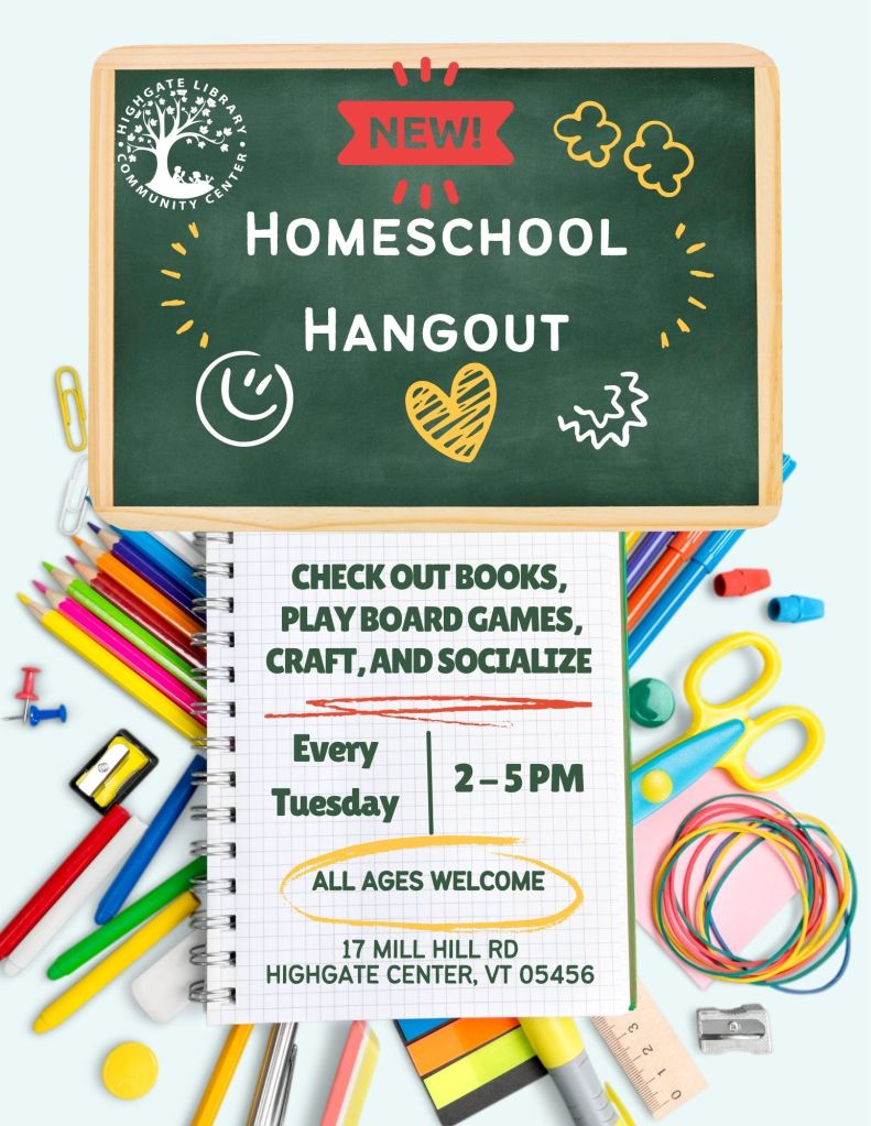 Homeschool Hangout We’d love to welcome our homeschool families for a special time at the library! All ages are welcome to our Homeschool Hangout! Play games, puzzles, craft, check out a book or 5 and just hang out! Share this: Share on Facebook (Opens in new window) Facebook Email a link to a friend (Opens in new window) Email