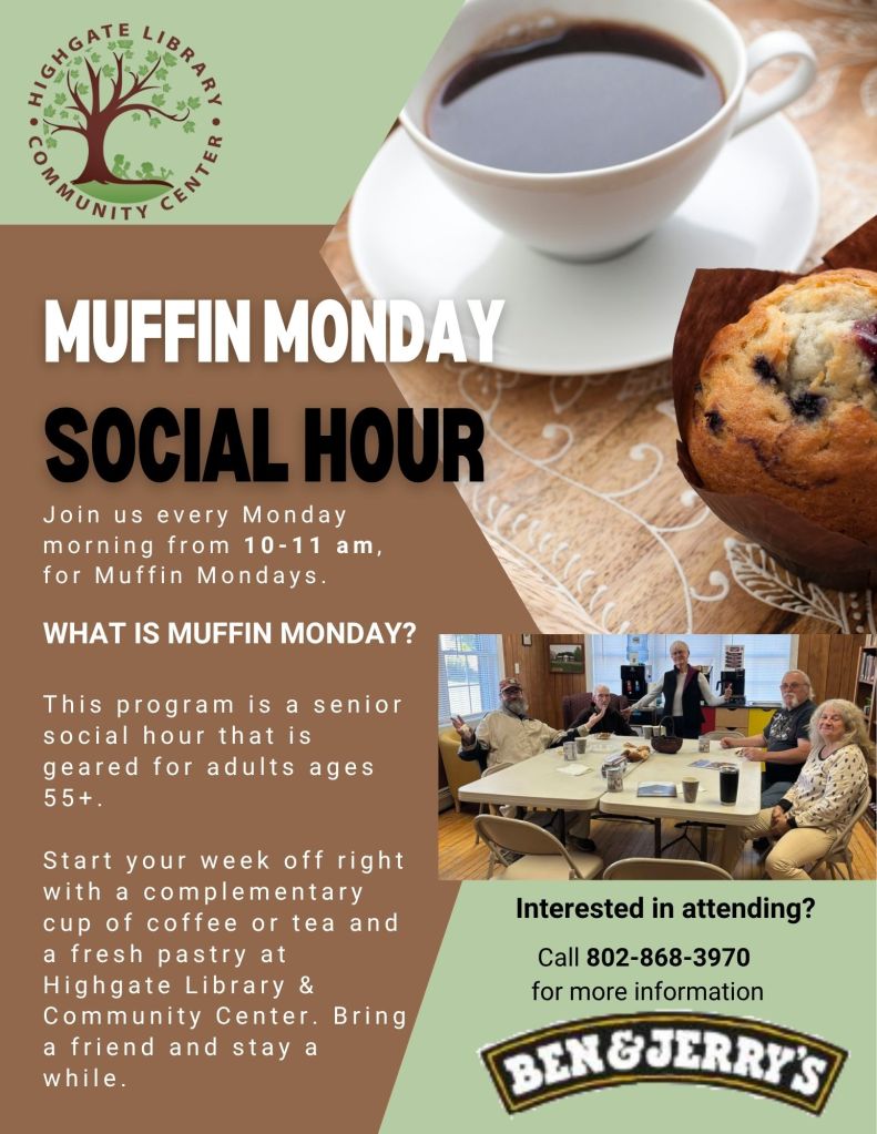 Muffin Monday Seniors Social Hour Start your week off right with HLCC’s newest Seniors Program: Muffin Monday. This program will run every Monday morning from 10 am – 11 am and is free to any participant ages 55 and older. Share this: Share on Facebook (Opens in new window) Facebook Email a link to a friend (Opens in new window) Email