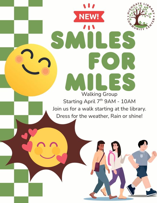 Smiles for Miles Join us for a walk starting at the library. All ages are welcome to join us. Dress for the weather, Rain or shine! Share this: Share on Facebook (Opens in new window) Facebook Email a link to a friend (Opens in new window) Email